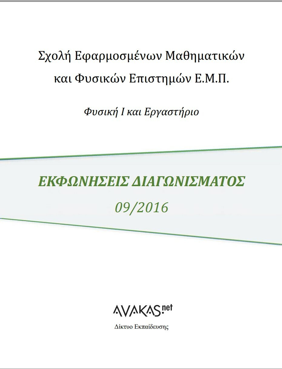 Εκφωνήσεις για το διαγώνισμα του μαθήματος Φυσική 1 (Μηχανική) και Εργαστήριο της επαναληπτικής εξεταστικής (09-2016) της Σχολής Εφαρμοσμένων Μαθηματικών και Φυσικών Επιστημών του Εθνικού Μετσόβιου Πολυτεχνείου.